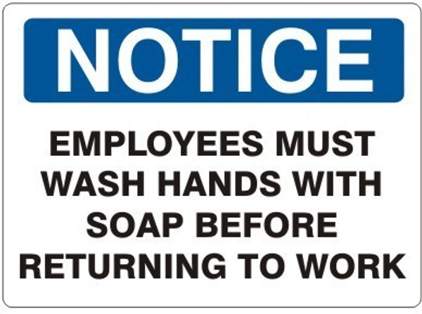 Our NOTICE sign, saying "Employees Must Wash Hands With Soap Before Returning To Work" serves as a constant visible reminder to teachers and staff. This sign is 10 x 14 in size, offered as a Plastic or Adhesive Vinyl sign. Straight from Safehouse Signs, this product is high quality, affordable and easy to install.